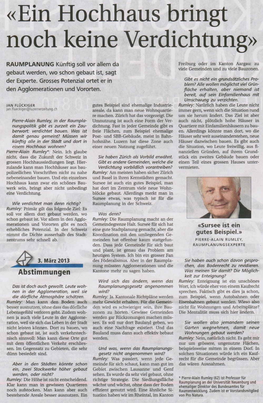 "Ein Hochhaus bringt noch keine Verdichtung", Neue Luzerner Zeitung, 11. Februar 2013, S. 5.
