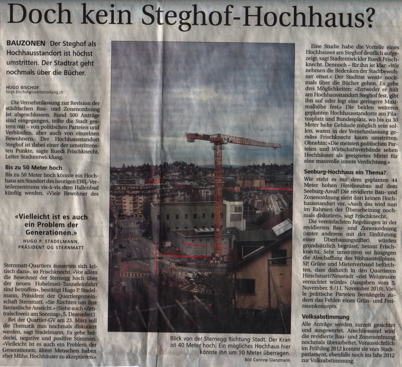 "Doch kein Steghof-Hochhaus?", Neue Luzerner Zeitung, 11. Jan. 2011, S. 23.
