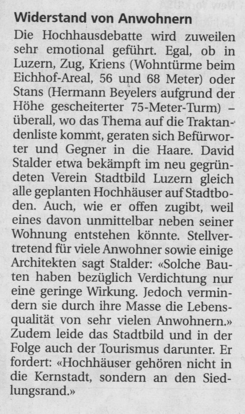 "Widerstand gegen die Hochhauszonen", Neue Luzerner Zeitung, 19. Sept. 2011, S. 13.