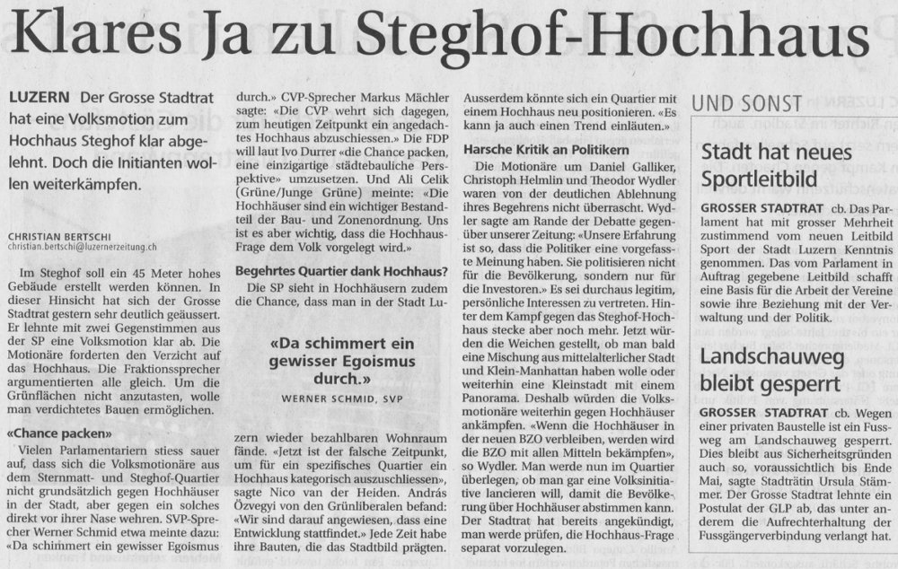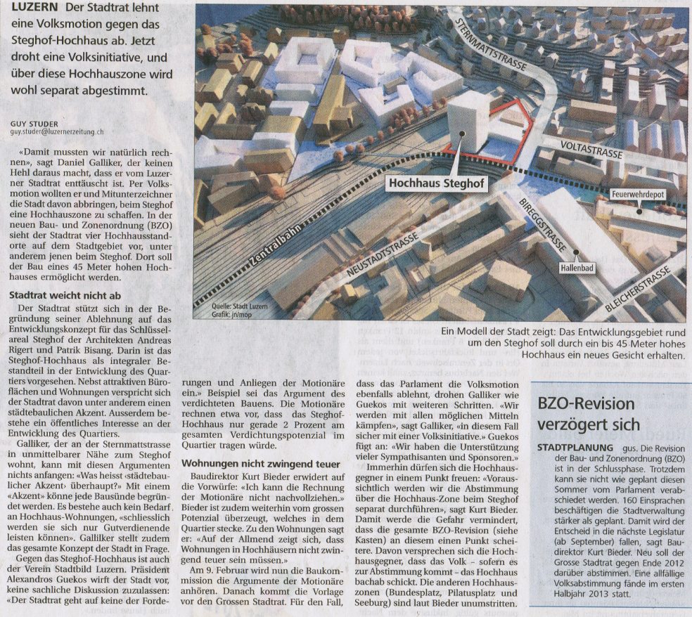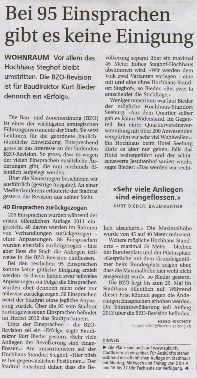 "Klares Ja zu Steghof-Hochhaus", Neue Luzerner Zeitung, 9. März 2012, S. 23.
