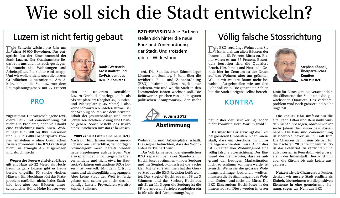 "Wie soll sich die Stadt entwickeln?", Neue Luzerner Zeitung, 31. Mai 2013, S. 24.