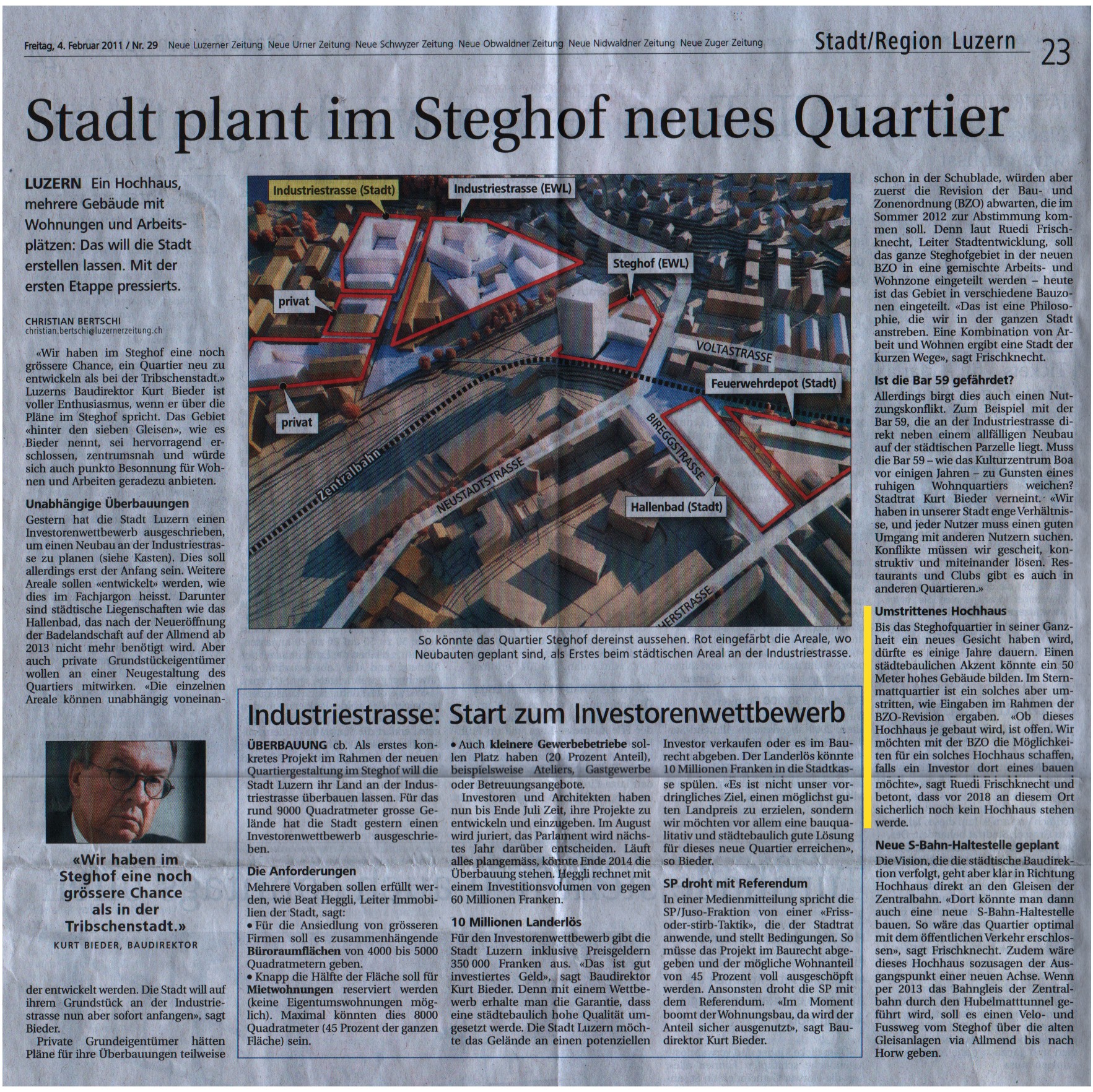 "Die Stadt plant im Steghof neues Quartier", Neue Luzerner Zeitung, 4. Feb. 2011, S. 23.