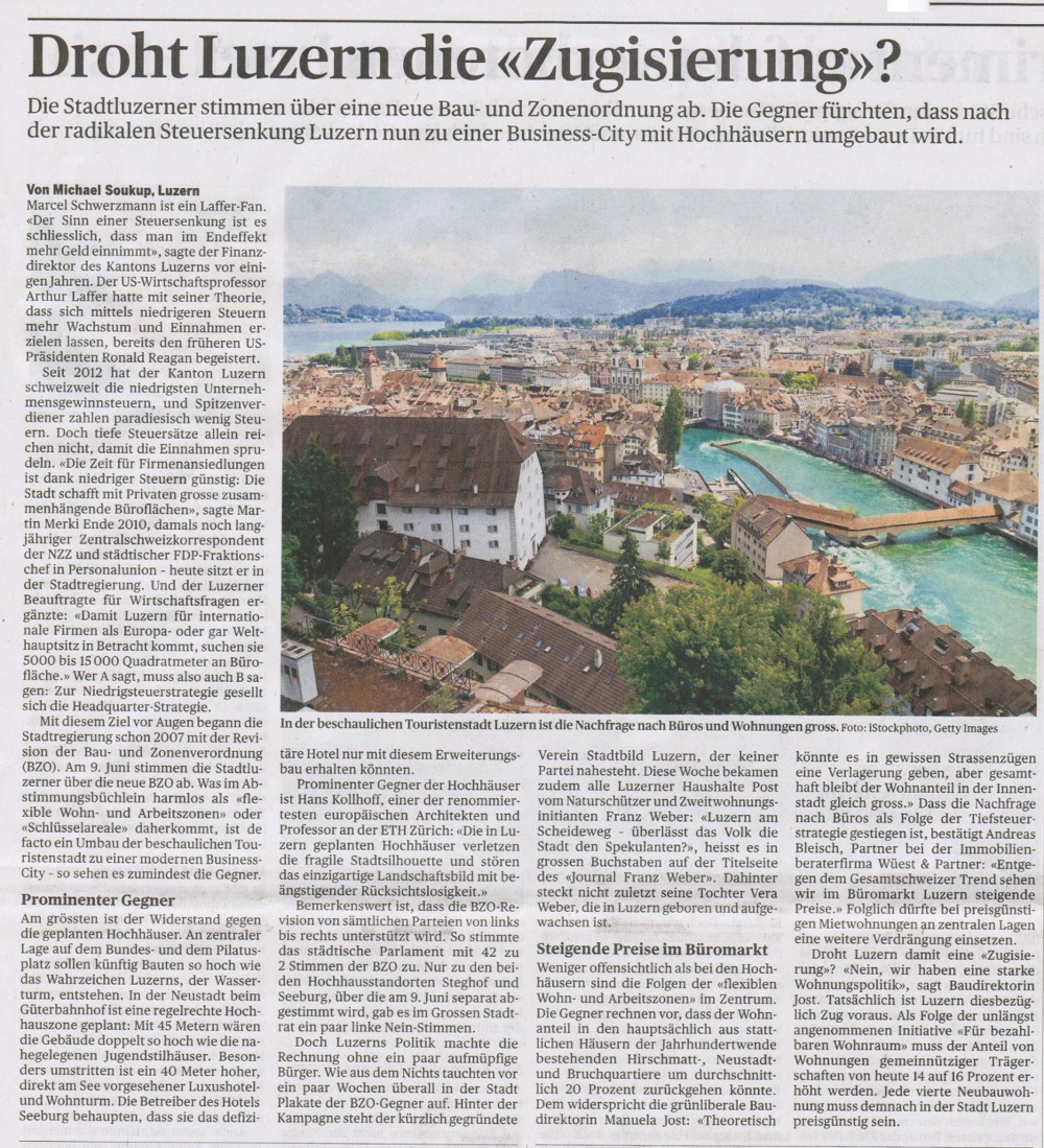 "Droht Luzern die Zugisierung?", Tages Anzeiger, 30. Mai 2013, S. 5.