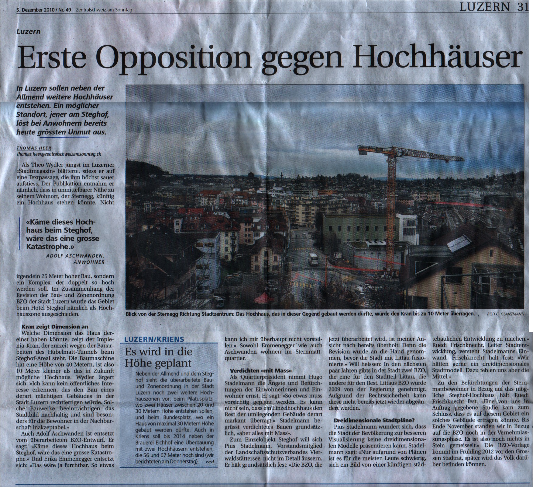 "Erste Opposition gegen Hochhäuser", Zentralschweiz am Sonntag, 5. Dez. 2010, S. 31.
