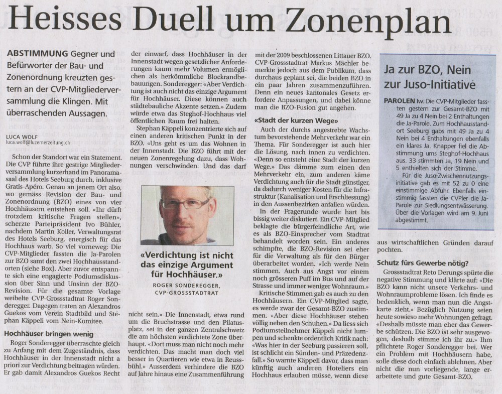 Am vergangenen Samstag haben wir unsere ordentliche Mitgliederversammlung 2013 durchgeführt. Unsere erfreulicherweise sehr zahlreich erschienenen Mitglieder haben dabei die Parole 3x NEIN zur BZO gefasst. Das bedeutet: NEIN zur Revision der Bau- und Zonenordnung (inkl. der Hochhausstandorte Pilatus- und Bundesplatz), NEIN zum Hochhausstandort Steghof und NEIN zum Hochhausstandort Seeburg.