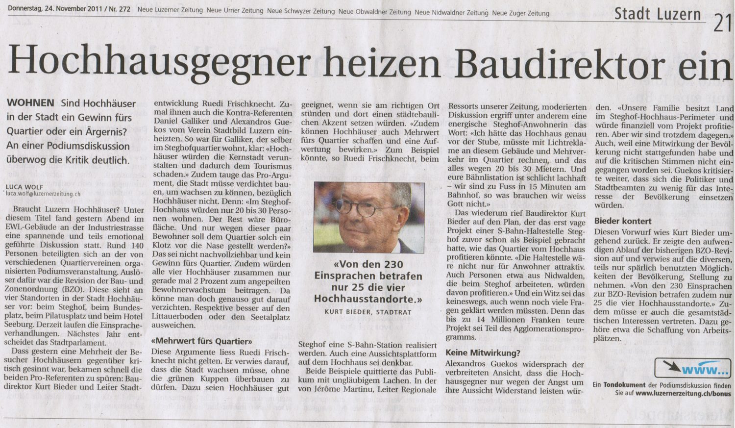 Am Mittwoch, 23. November findet ab 19 Uhr im ewl-Gebäude (Industriestrasse 6) eine Podiumsdiskussion zum Thema Hochhäuser mit Mitgliedern unserers Vereins und Vertretern der städischen Behörden statt. Weitere Informationen finden Sie auf dem Flyer. Wir freuen uns, dem Publiukm unsere Argumente näherbringen zu können.